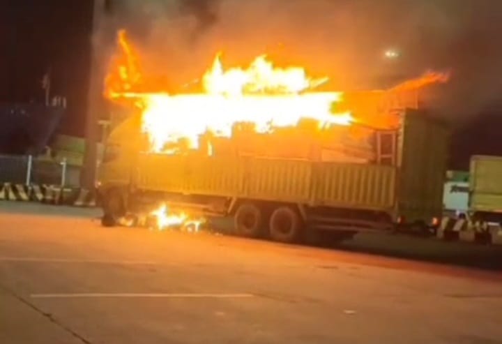Kendaraan truk ekspedisi JNE dengan nomor polisi B 9289 NEU, pada Jumat (26/9/2025) dinihari, ludes terbakar di area Dermaga 1 (satu) ASDP Merak, Kota Cilegon, Provinsi Banten. (Foto : tangkap layar)