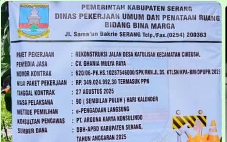 Serang Banten, Skemarubrik.com | — Adanya kegiatan pembangunan Rekontruksi jalan sangat diharapkan oleh seluruh lapisan masyarakat ‘akan tapi sangat berbeda dengan kegiatan Yang ada diwilayaha kabupaten serang pasalnya proyek yang dikerjakan oleh CV. GHANIA MULYA RAYA dengan anggaran Rp.349.024.992,00 yang bersumber dari DBH APBD KABUPATEN SERANG TAHUN ANGGARAN 2025 sangat berbeda dengan anggaran yang fantastis besar.