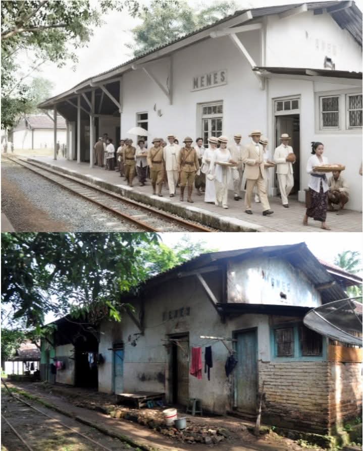 Sebaliknya, foto bagian bawah menunjukkan Realita Masa Kini. Setelah jalur ini dinonaktifkan pada tahun 1982, kemegahan bangunan Staatsspoorwegen tersebut memudar. Papan nama “MENES” yang dulu gagah kini kusam, dindingnya mengelupas, dan area peron berubah menjadi ruang domestik dengan jemuran pakaian serta perkakas warga. Rel yang dulu dilalui lokomotif uap kini sunyi, terkubur tanah dan semak belukar.