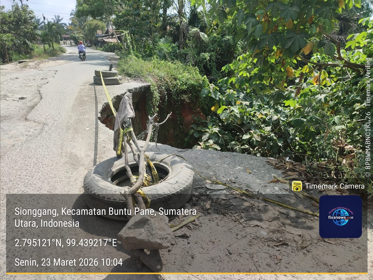 Asahan-Sumut, SkemaRubrik.com | — Jalan lintas Kisaran–Pematang Siantar di Sionggang, Kecamatan Buntu Pane, Kabupaten Asahan nyaris putus akibat longsor. Terlihat separuh badan jalan sudah longsor di sisi jurang yang membuat kendaraan harus bergantian melewatinya. Warga khawatir jalan akan putus total. Selain itu, sudah banyak kecelakaan yang terjadi akibat jalan rusak terutama di malam hari.