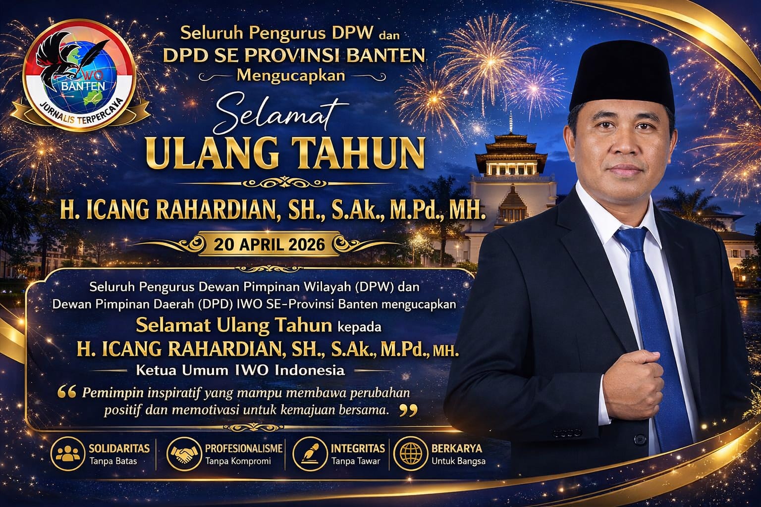BANTEN | SkemaRubrik.com — Seluruh jajaran Dewan Pimpinan Wilayah (DPW) dan Dewan Pimpinan Daerah (DPD) Ikatan Wartawan Online Indonesia (IWO-I) se-Provinsi Banten secara serentak menyampaikan ucapan selamat ulang tahun kepada Ketua Umum IWO Indonesia, H. Icang Rahardian, SH., S.Ak., M.Pd., MH.